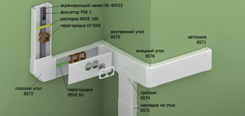 | Рекомендации производителей Отдельные кабели могут быть экранированы от электромагнитного излучения путем установки экранирующего канала, если это необходимо, чтобы избежать помех. В случае монтажа экранирующего канала SK 40X33 (выше) невозможно использовать приборы с большей глубиной установки, например, разрядник для защиты от перенапряжений. |